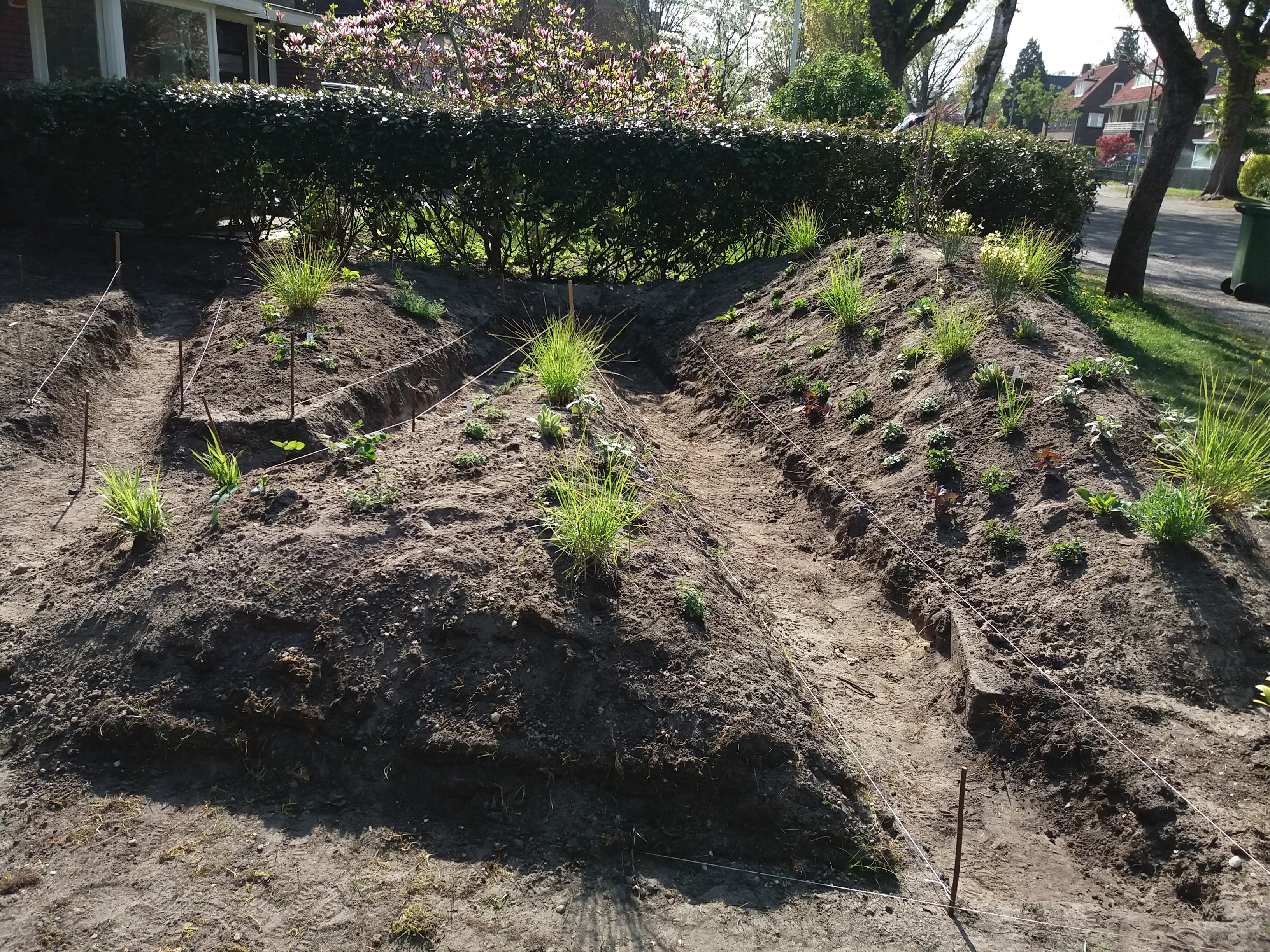 Van rommelplek in achtertuin (foto rechtsboven) naar nieuwe zitplek met zonneborder. Grassen en inheemse (bijen-)planten ivm de zanderige bosgrond.