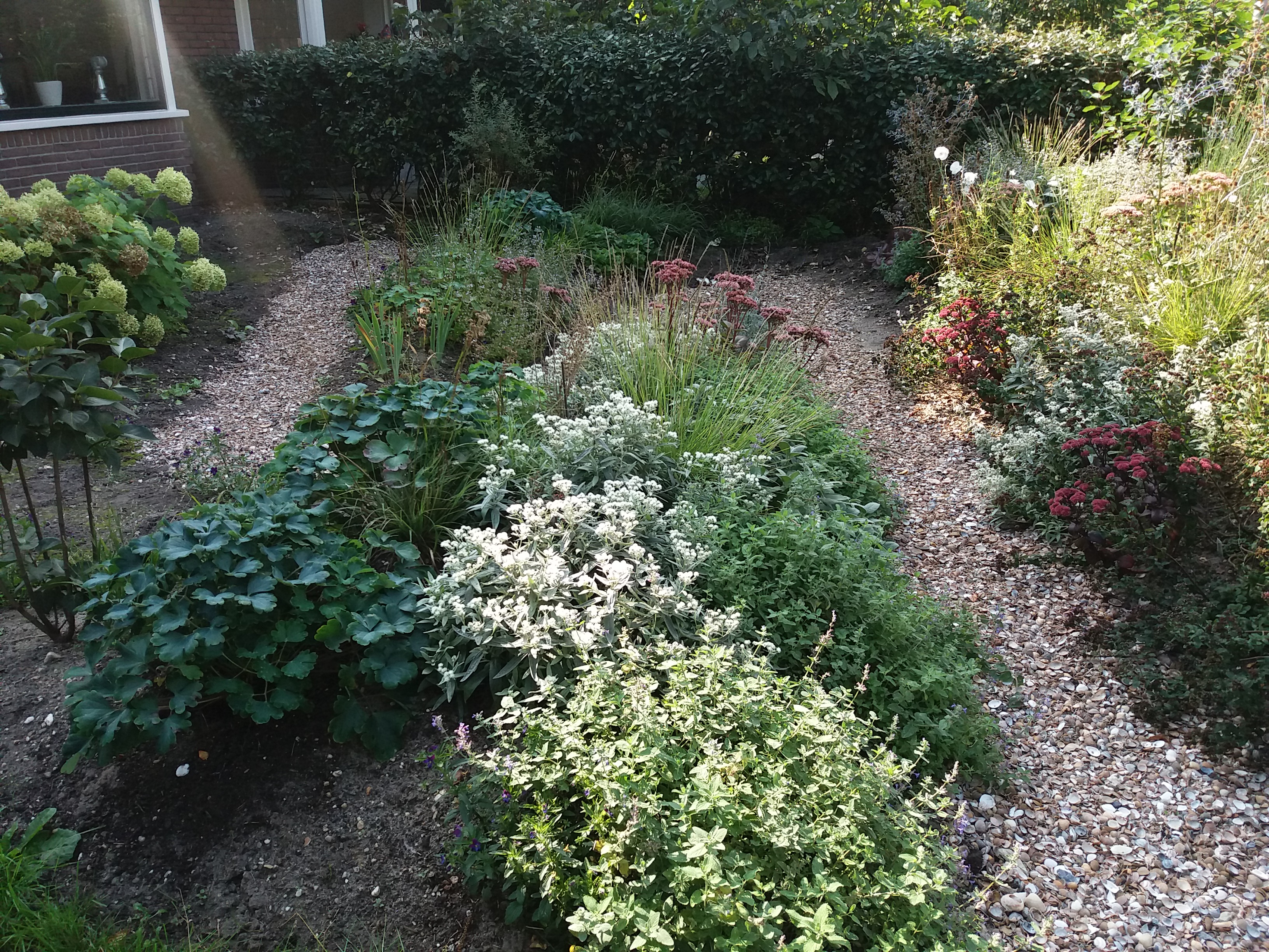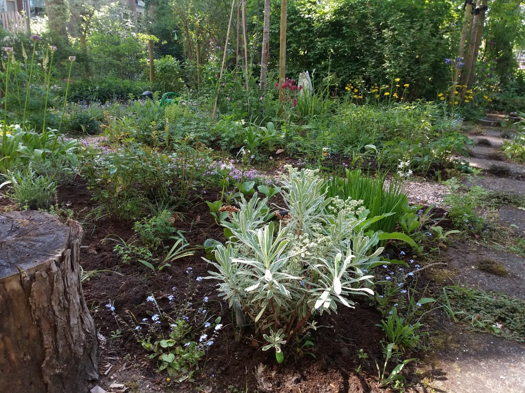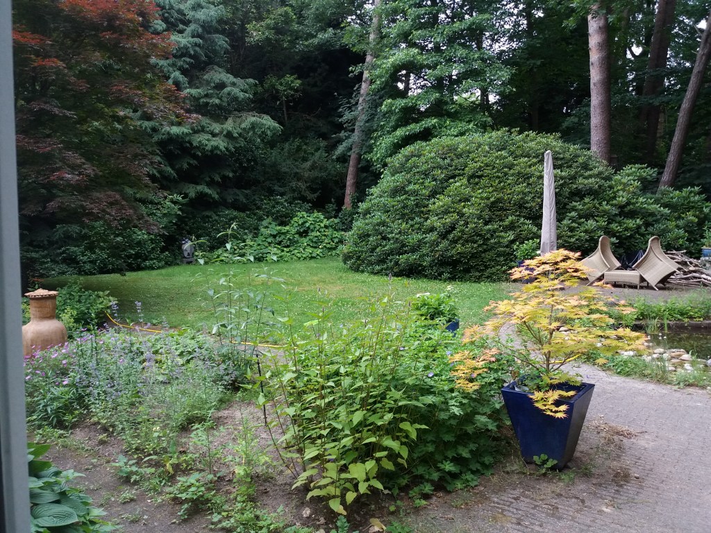 Wens: een natuurlijker tuin met meer kleur en bloemen en minder onderhoud. Meerjarenproject waarin de tuin zich ontwikkelt adhv het thema Wonen-in-het-bos: in een bos heerst een intieme sfeer, die ontstaat door omslotenheid, hoogte, doorkijkjes en gefilterd licht en zachte materialen en vormen. Dat betekent concreet: liever hout dan steen als materiaal, afgeronde vormen dus rondlopende paden en heuveltjes, een boomgroepje bij het huis, en zachte overgangen. Door dit concept als leidraad aan te houden, kan een bossfeer worden opgeroepen of versterkt. Wordt vervolgd…