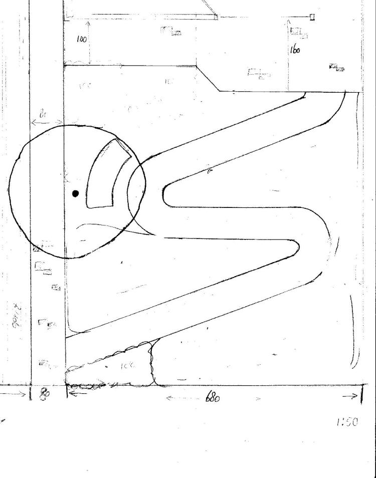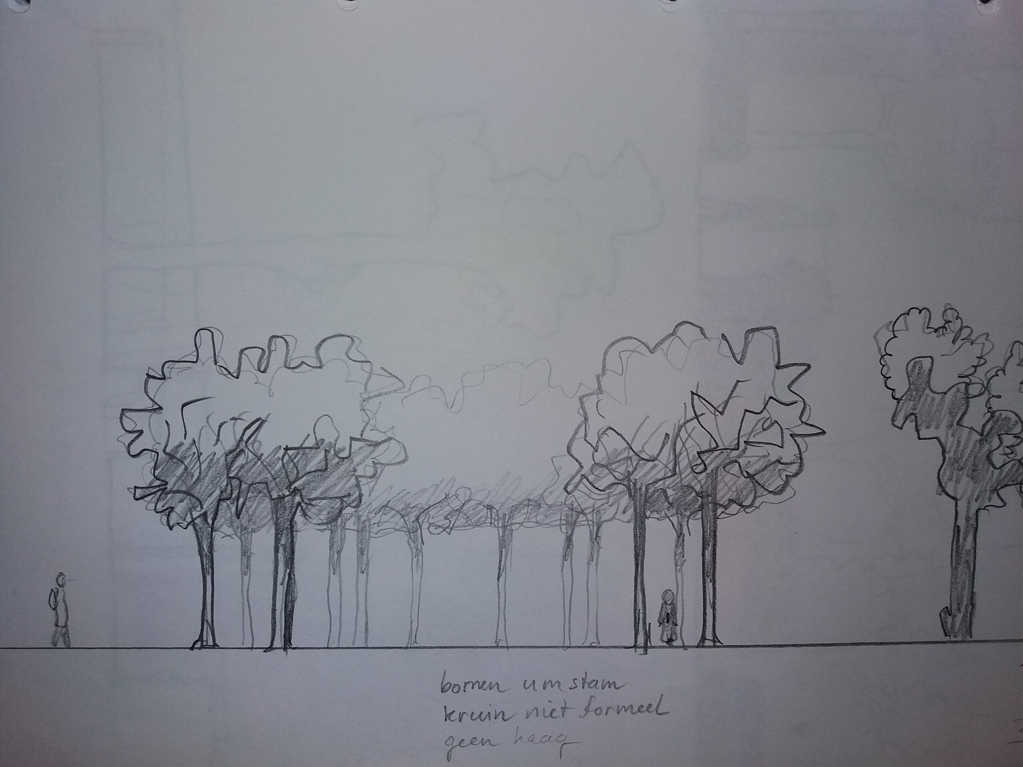 (Ontwerp-opdracht tijdens cursus Ontwerpen voor Tuin en Park van Het Ontwerpinstituut.) Uitgangssituatie: ruimte tussen kerk en voormalig klooster, pal aan drukke winkelstraat. Wens: openbare ruimte met oa kruidentuin, sobere uitstraling. Thema door mij bedacht: wandeling naar stilte. Vertaling: om te wandelen zijn ruimte en tijd nodig en die geven de wandelaar de mogelijkheid tot rust te komen en stil te worden. Dus een pad met zekere lengte is nodig. Via een cortèn-stalen kruidentuin met geuren en kleuren aan de drukke straatkant, bereikt men de stilteplek, een in een vierkant rondgaand pad tussen 2 rijen bomen, als de 4 gangen om een kloostertuin (Hortus conclusus).